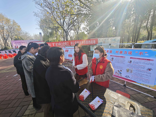 家庭是社会的细胞,家庭的安宁是社会稳定的基石,反对和消除家庭暴力是全社会共同的责任。11月25日是“国际消除家庭暴力日”,宝丰县人民法院组织干警走进宝丰县人民公园西广场,开展了一场以“关爱家庭,对暴力说不”为主题的普法宣传活动。