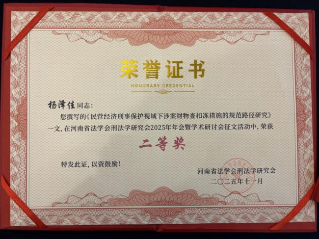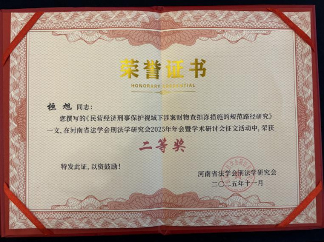 12月6日,河南省法学会刑法学研究会2025年年会暨学术研讨会在焦作召开。在此次年会征文中,宝丰法院桓旭、杨泽佳共同撰写的论文《民营经济刑事保护视域下涉案财物查扣冻措施的规范路径研究》荣获二等奖,该论文立足刑事司法实践,紧扣民营经济保护中的现实难点,围绕涉案财物查扣冻措施的规范化展开深入探讨,兼具理论价值与实践指导意义,体现了较高的学术水平和扎实的业务功底。