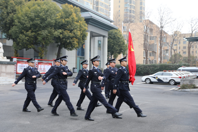 上午9时整,升旗仪式正式开始。由院司法警察组成的国旗护卫队迈着铿锵有力、整齐划一的步伐,庄严护卫五星红旗走向升旗台。在雄壮激昂的《义勇军进行曲》中,全体干警面向国旗肃立,行注目礼,鲜艳的五星红旗迎着朝阳冉冉升起,迎风飘扬,点燃了每一位干警心中的爱国热情与职业自豪感。