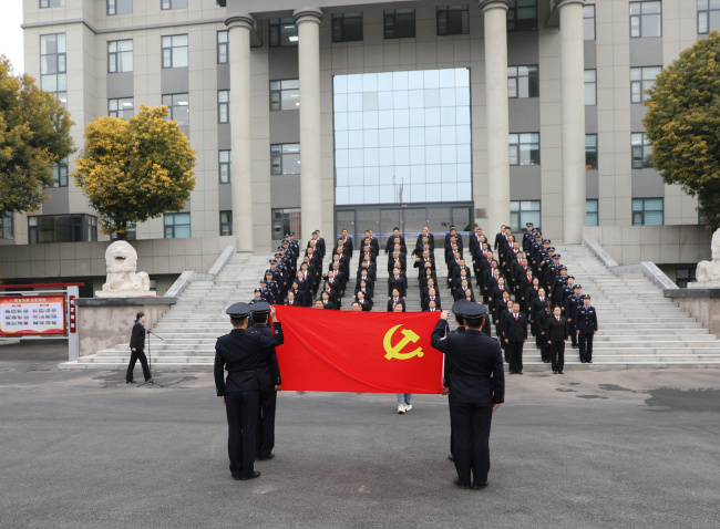 升旗礼毕,三名干警代表依次发言,党员干警在院机关党委副书记李应敏的带领下重温入党誓词,全体干警整齐列队,高举右拳,再次许下对党忠诚、为共产主义事业奋斗终身的铮铮誓言,展现法院干警忠诚于党、司法为民的坚定信念。