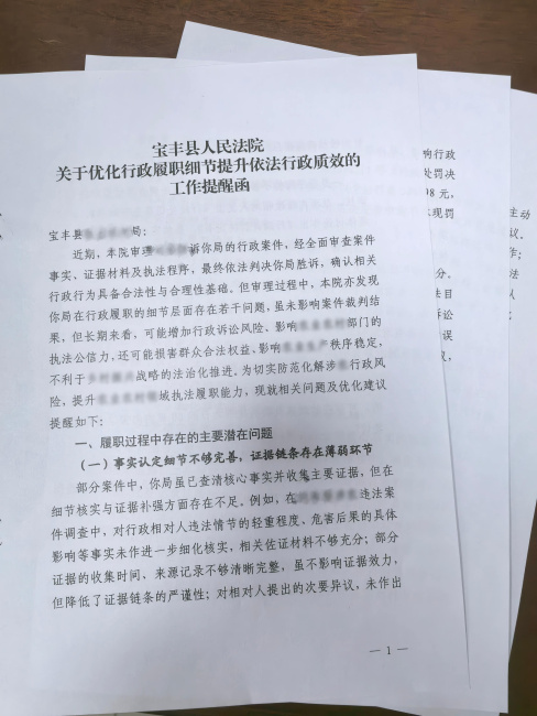 1月16 日,宝丰县人民法院在审结刘某诉县某局行政诉讼案件后向该局发出工作提醒函。该函以延伸行政审判职能为抓手,结合法院审理视角,聚焦该局胜诉案件中未影响裁判结果但需规范的履职问题,以“肯定合法基础+指出潜在风险+明确优化方向”为逻辑,既保障行政机关执法积极性,又精准提示改进要点。为法治政府建设与乡村振兴法治化推进注入司法动能,成为基层法院以司法赋能社会治理的创新实践。